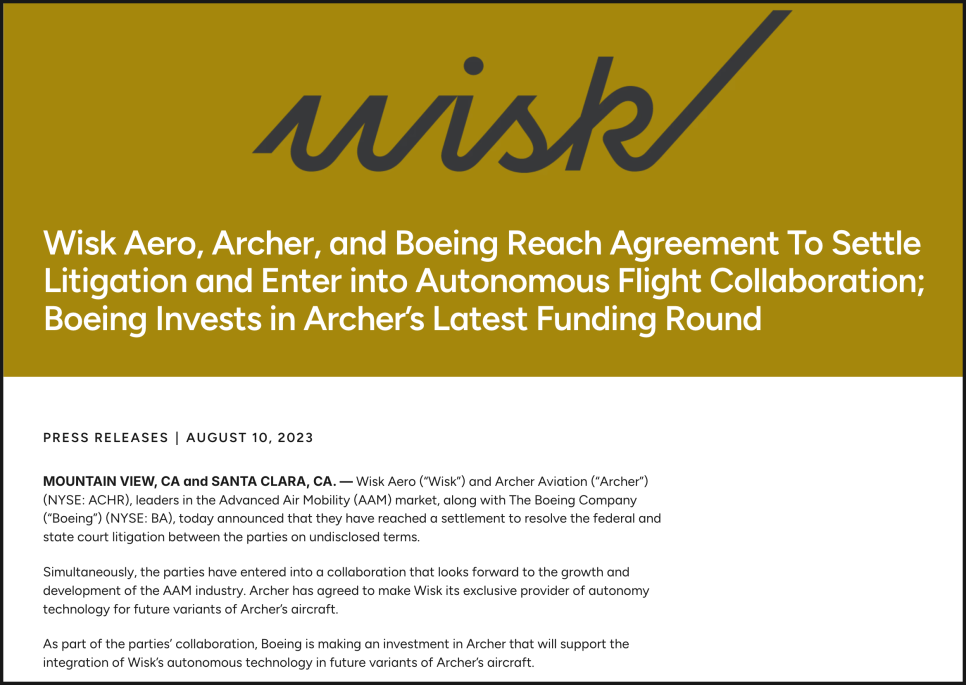 예를 들어, 아처는 이전에도 보잉(Boeing)의 자회사 위스크(Wisk)로부터 2021년에 기밀정보 절도 혐의로 소송을 당했는데, 그때도 전 직원이 기술 자료를 가져갔다는 의혹이 있었습니다. 이 소송은 2년에 걸쳐 진행된 끝에 2023년에 합의로 종료됐고, 양사는 향후 기술 협력을 약속했습니다.