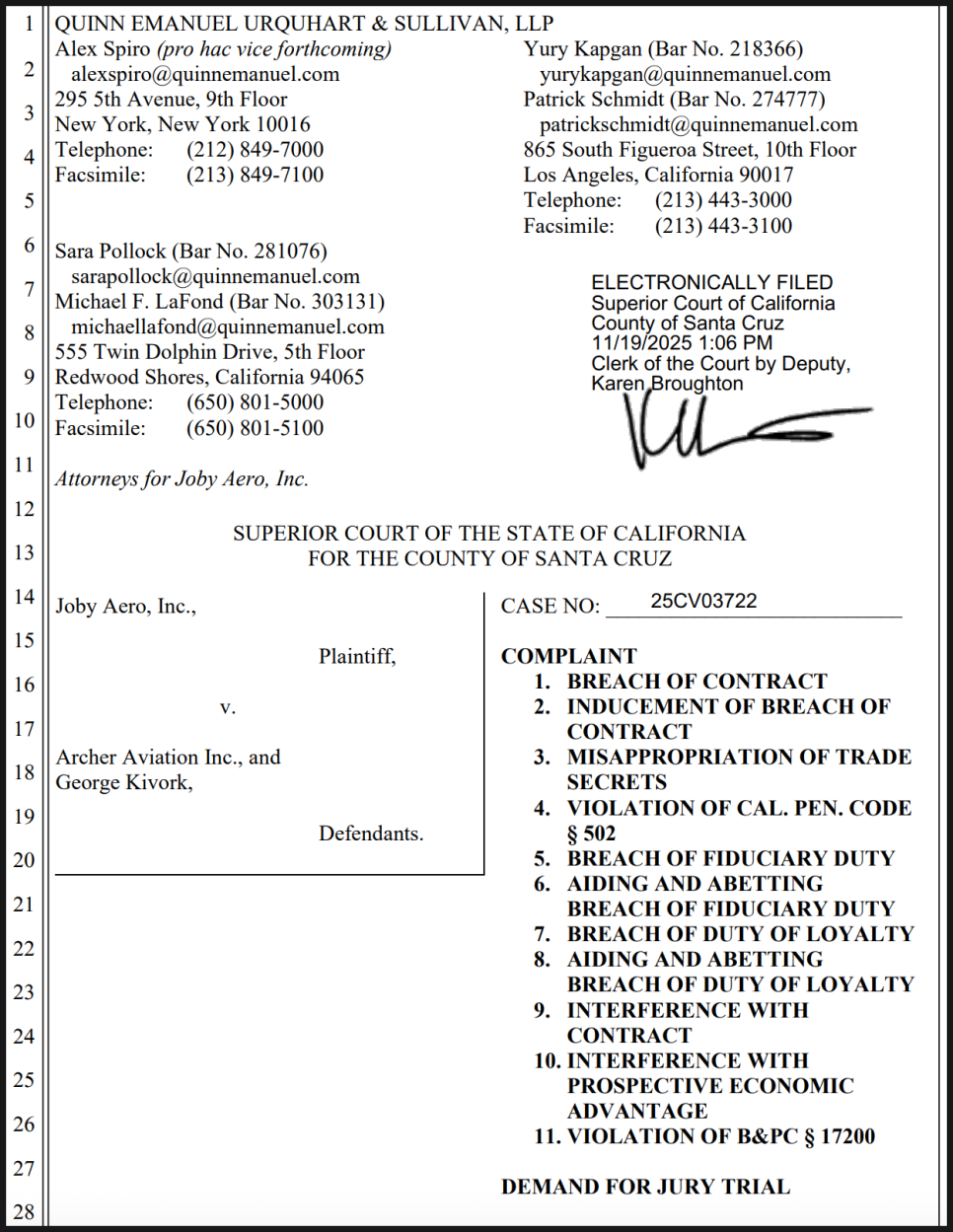 조비 에비에이션(Joby Aviation)이 아처 에비에이션(Archer Aviation)을 상대로 캘리포니아주 산타크루즈 법원에 소송을 제기했습니다. 조비는 아처가 조비의 전 직원인 조지 키보크(George Kivork)를 고용하면서, 그가 조비의 기밀 파일과 비즈니스 전략 문서를 대량으로 가져왔고 이를 바탕으로 조비의 파트너십을 ‘가로채려 했다’고 주장하고 있는데요.