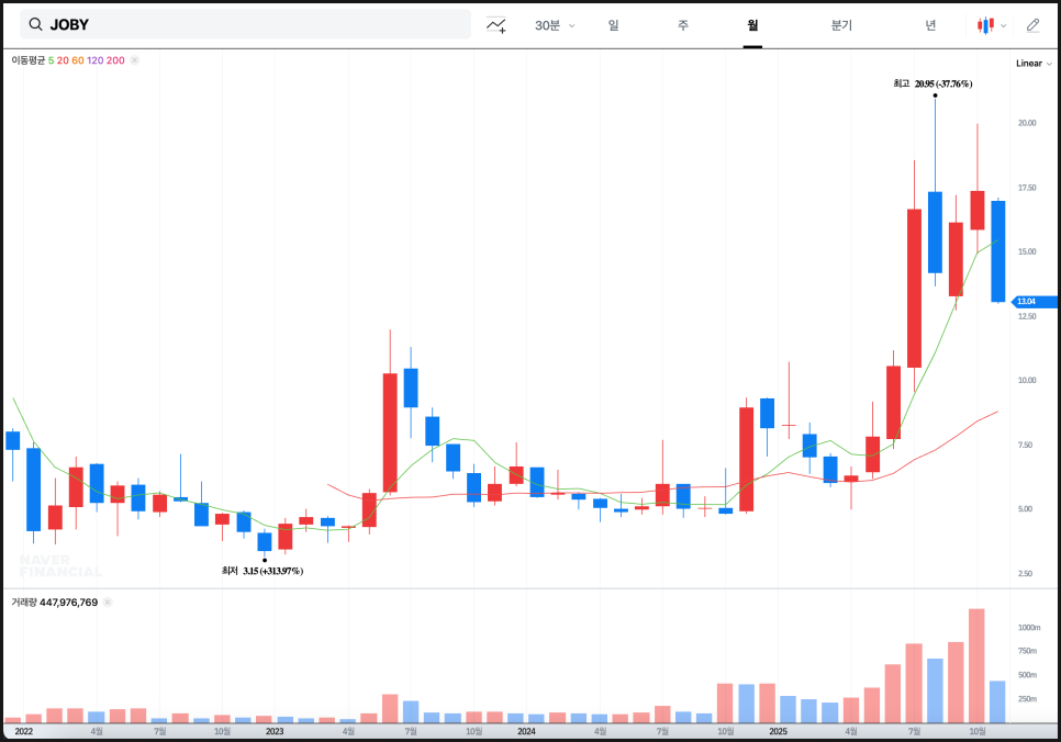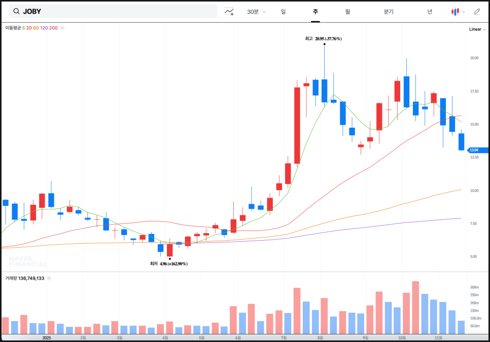월봉을 보면 JOBY 주가는 지난해와 올해 초 긴 침체를 겪은 뒤 2025년에 들어서 본격적인 추세 전환을 만들어낸 상태입니다.