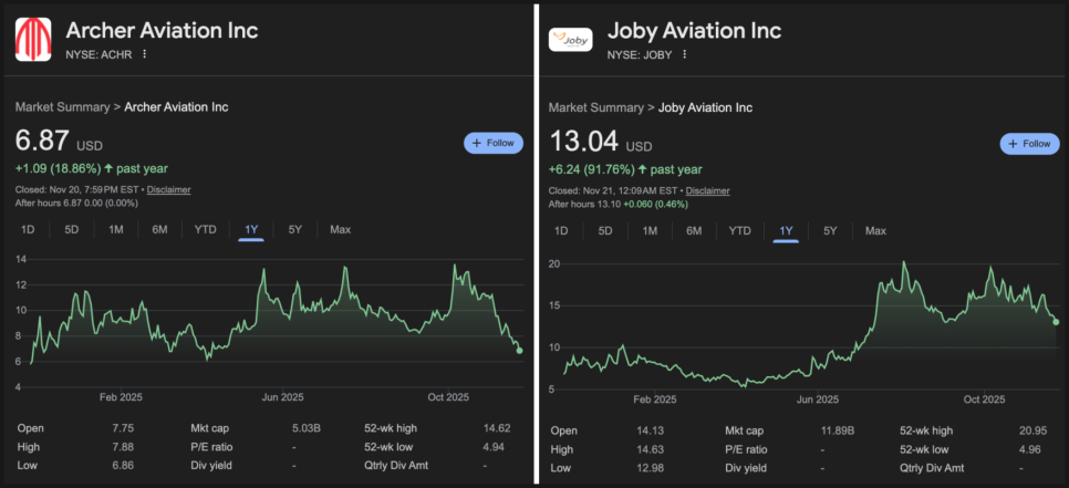 2025년 11월 21일에 다룰 종목은 아처 에비에이션(ACHR)과 조비 에비에이션(JOBY)입니다.