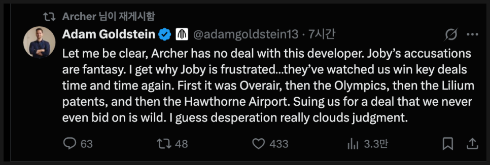 여기에 아처 창업자 겸 CEO 애덤 골드스타인(Adam Goldstein) 역시 SNS에서 조비의 주장에 전면 반박했습니다: