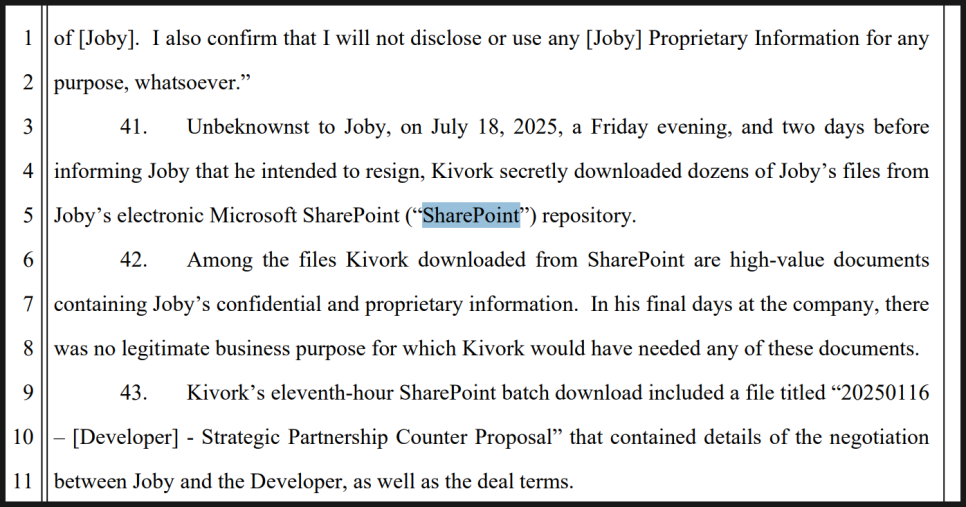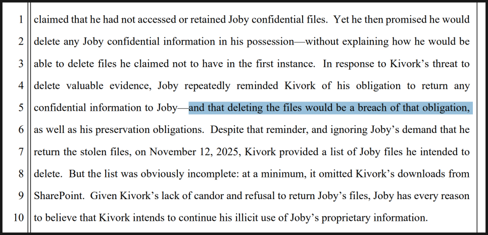 게다가 조비가 정식으로 “파일을 삭제하지 말고 모두 반환하라”고 요구했을 때, Kivork는 오히려 자신이 삭제하려는 파일 목록을 보내왔다고 하는데요. 문제는 그 목록이 현저하게 미비했다는 점입니다. 특히 SharePoint에서 내려받은 파일들이 모두 빠져 있었다고 Joby는 주장하는데, 이 부분이 “은폐 가능성”을 언급하는 근거가 되었습니다.