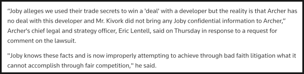 “조비는 우리가 그 개발사와의 계약을 따내기 위해 그들의 영업비밀을 사용했다고 주장하지만, 실제로 아처는 그 개발사와 어떤 계약도 맺지 않았습니다. 그리고 키보크(Kivork) 씨가 조비의 기밀 정보를 아처로 가져온 사실도 없습니다.”