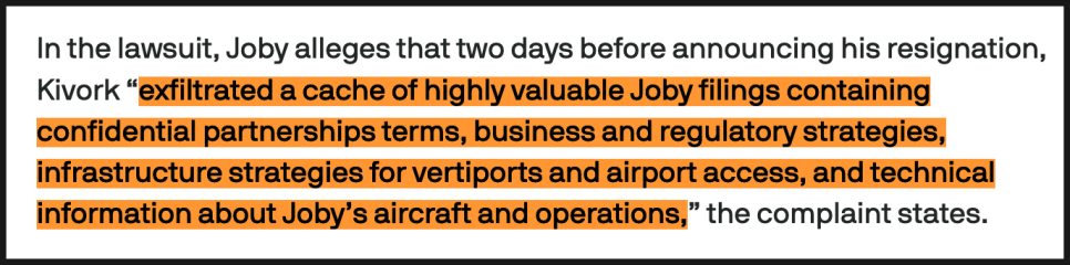 조비의 주장에 따르면, 조비의 전 직원 조지 키보크(George Kivork)는 퇴사를 발표하기 이틀 전, 조비의 내부 파일들을 대량으로 자신의 개인 이메일로 전송했고, 파일 접근 권한까지 바꿔 퇴사 후에도 접근할 수 있도록 설정했다고 합니다. 조비는 이를 포렌식 조사를 통해 확인했다고 밝혔습니다.