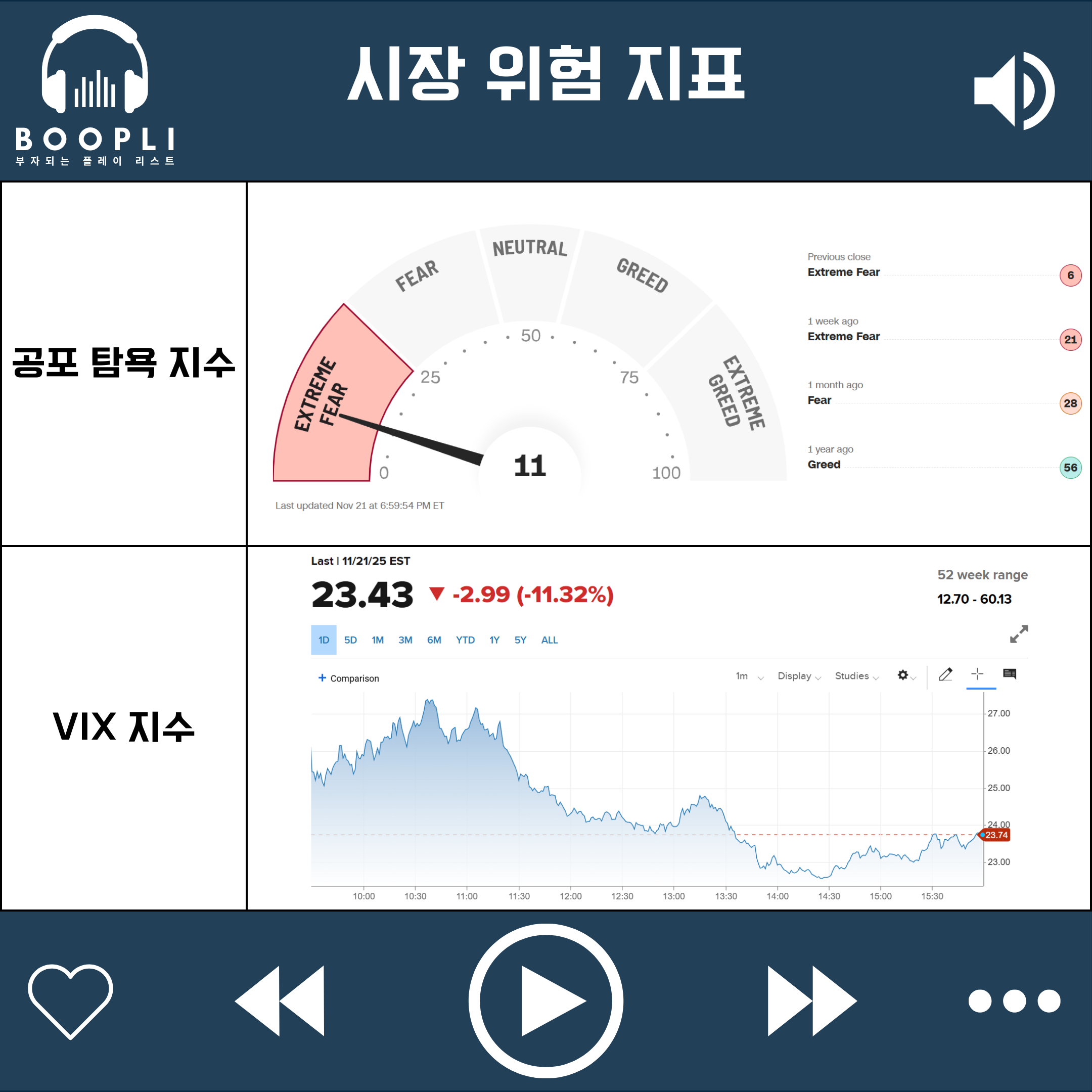 그러나 장중 발표된 11월 미시간대 소비자심리지수가 51.0으로 예상치를 상회하고, 1년 기대 인플레이션(4.5%)과 5년 기대 인플레이션(3.4%)이 모두 예상을 하회하자 금리 인하 가능성은 다시 강화되었고 투자심리가 회복세로 전환