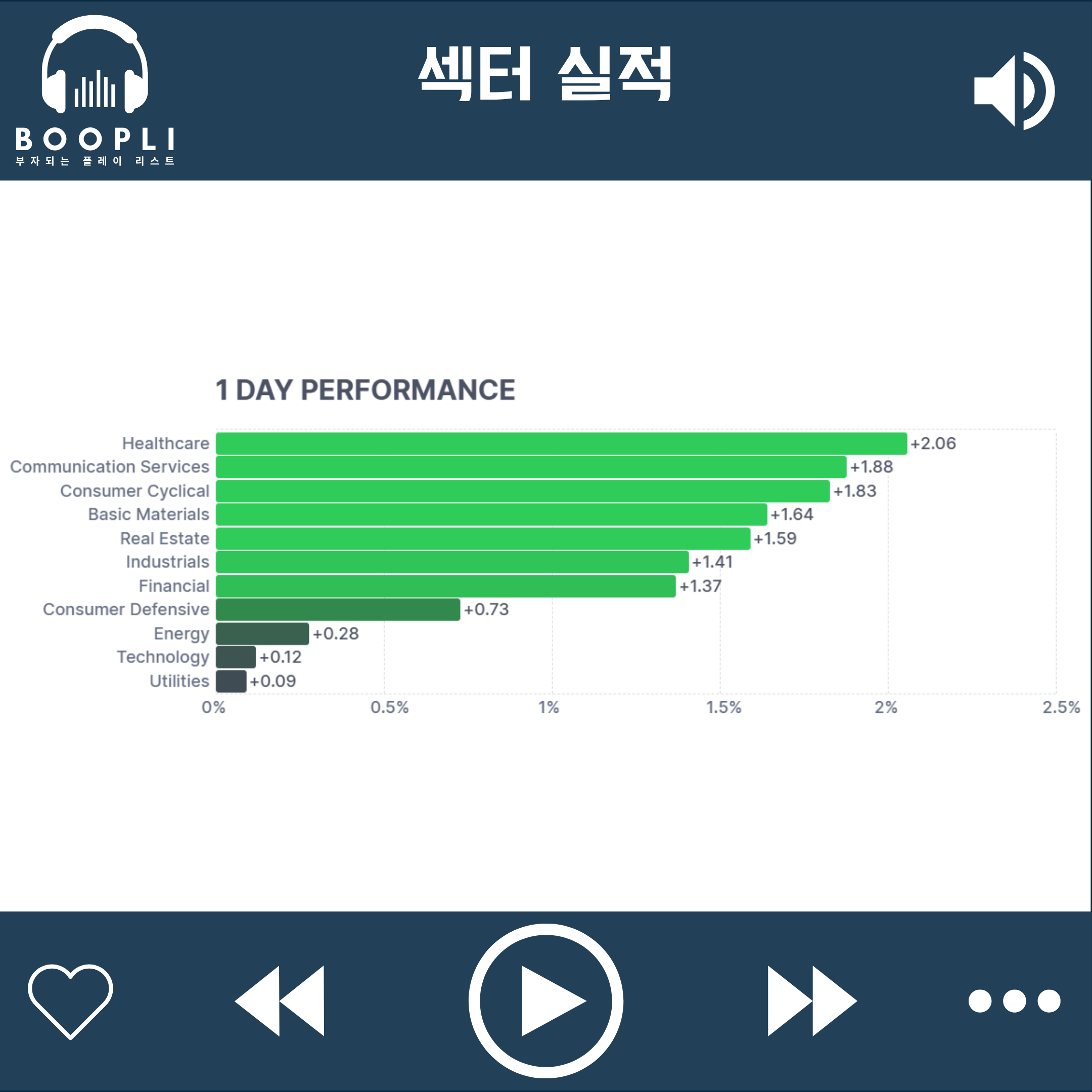 헬스케어 섹터가 상승을 주도했고, 이어서 커뮤니케이션 서비스, 소비 순환재, 원자재, 부동산, 산업재, 금융, 경기 방어주 순으로 강세