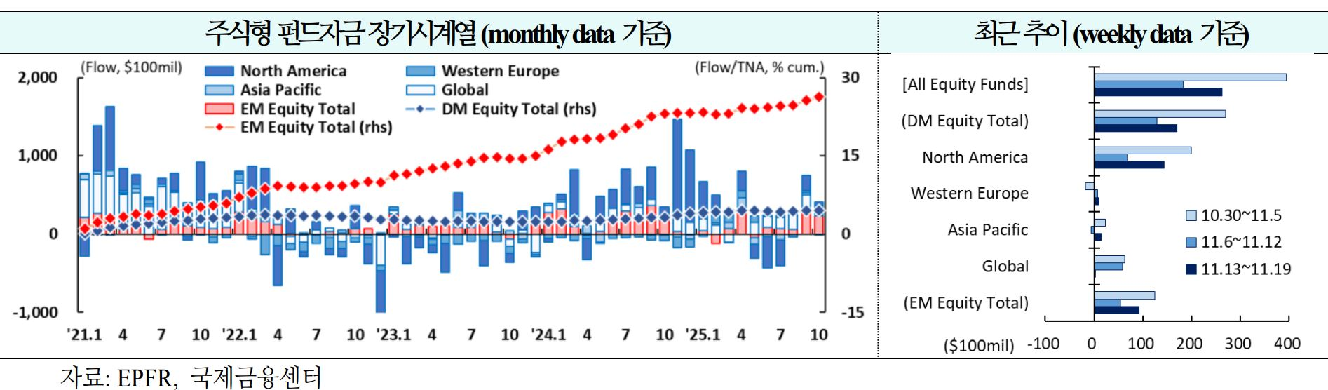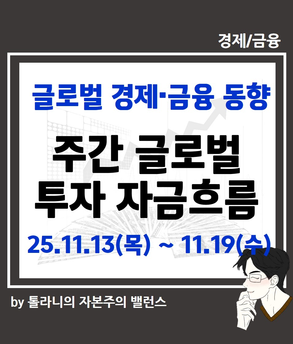 이에 ‘주간 글로벌 투자 자금 흐름(25년 11월 13일(목) ~ 11월 19일(수))’ 관련하여 국제금융센터 보고서를 통해 좀 더 자세히 알아보도록 하겠습니다.
