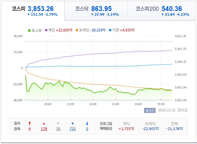 한국의 경우 코스피 4000 돌파 이후 상승세를 보이던 주가는 그동안 상승했던 반도체 관련 주식들이 큰 폭의 하락을 보이면서 21일 기준으로 3853.26까지 밀렸는데요.