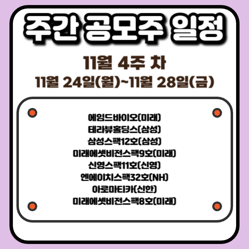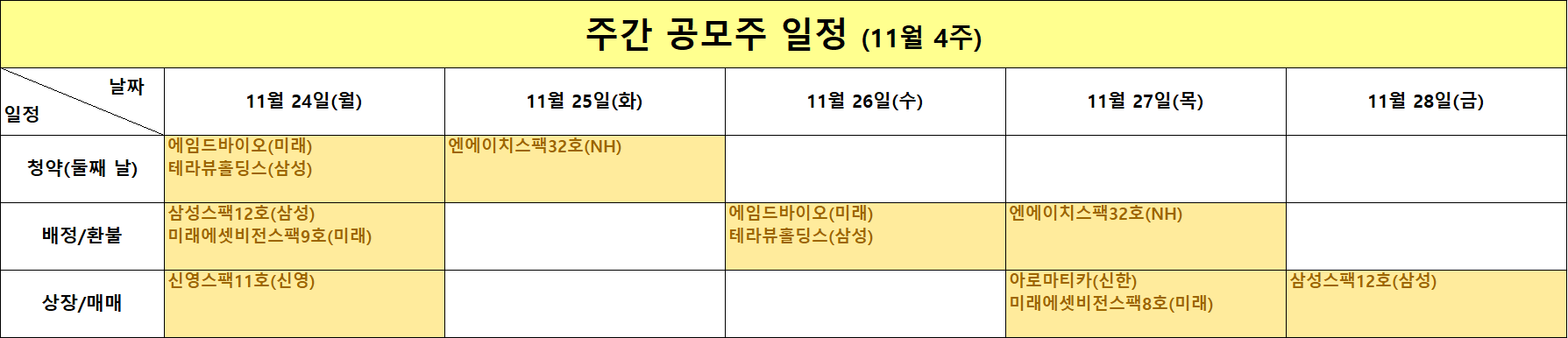 다가오는 11월 4주 차에는 공모주 일정이 스팩 중심으로 전개될 예정이라서 당일매도 전략을 고려하시는 분들께서는 흐름을 미리 살펴보시면 도움이 될 것 같습니다. 이번 주는 청약과 환불 그리고 상장 일정이 고르게 분포되어 있기 때문에 자금 회전 계획을 세우기에 적절한 구조로 보였습니다.