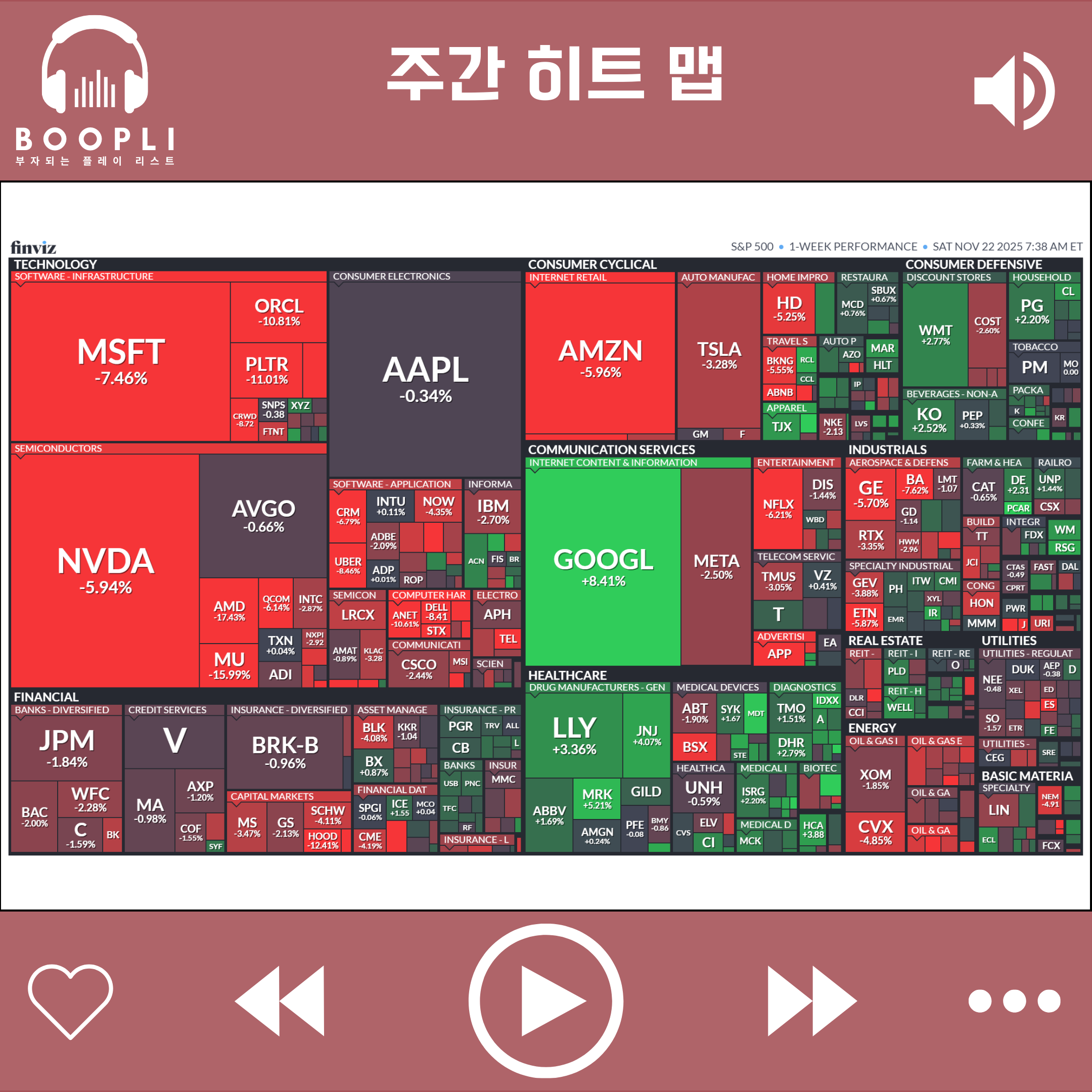 이번 주에는 구글의 최신 AI모델 '제미나이3'가 호평을 받자 커뮤니케이션 서비스 섹터가 상승을 주도, 이어서 헬스케어, 경기 방어주 순으로 강세를 보였다.
