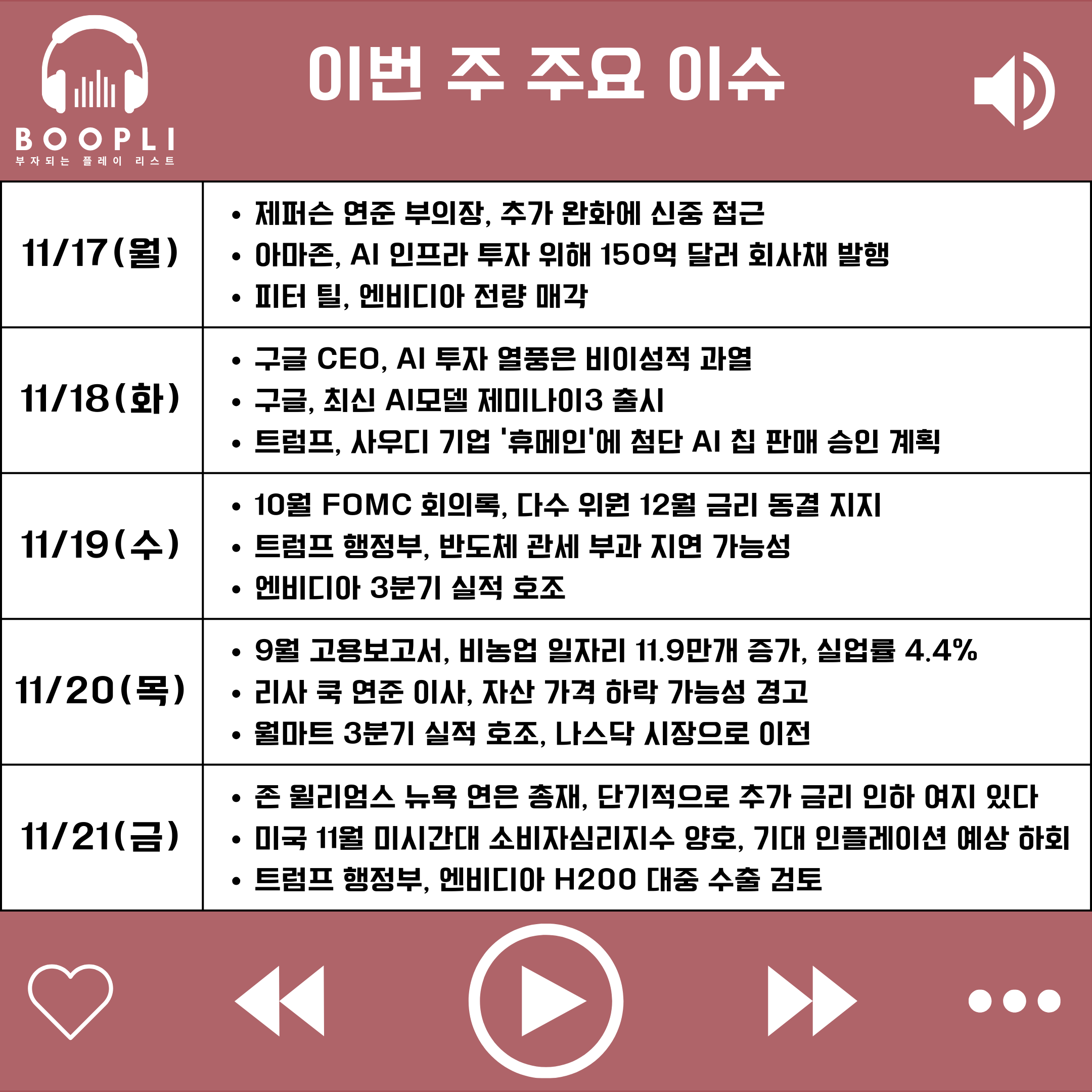 주 초반에는 연준 인사들의 신중론에 12월 금리 인하 기대가 후퇴하고 구글 CEO의 AI 과열 경고 및 기관들의 차익 실현 물량이 출회되며 하락 출발했다.