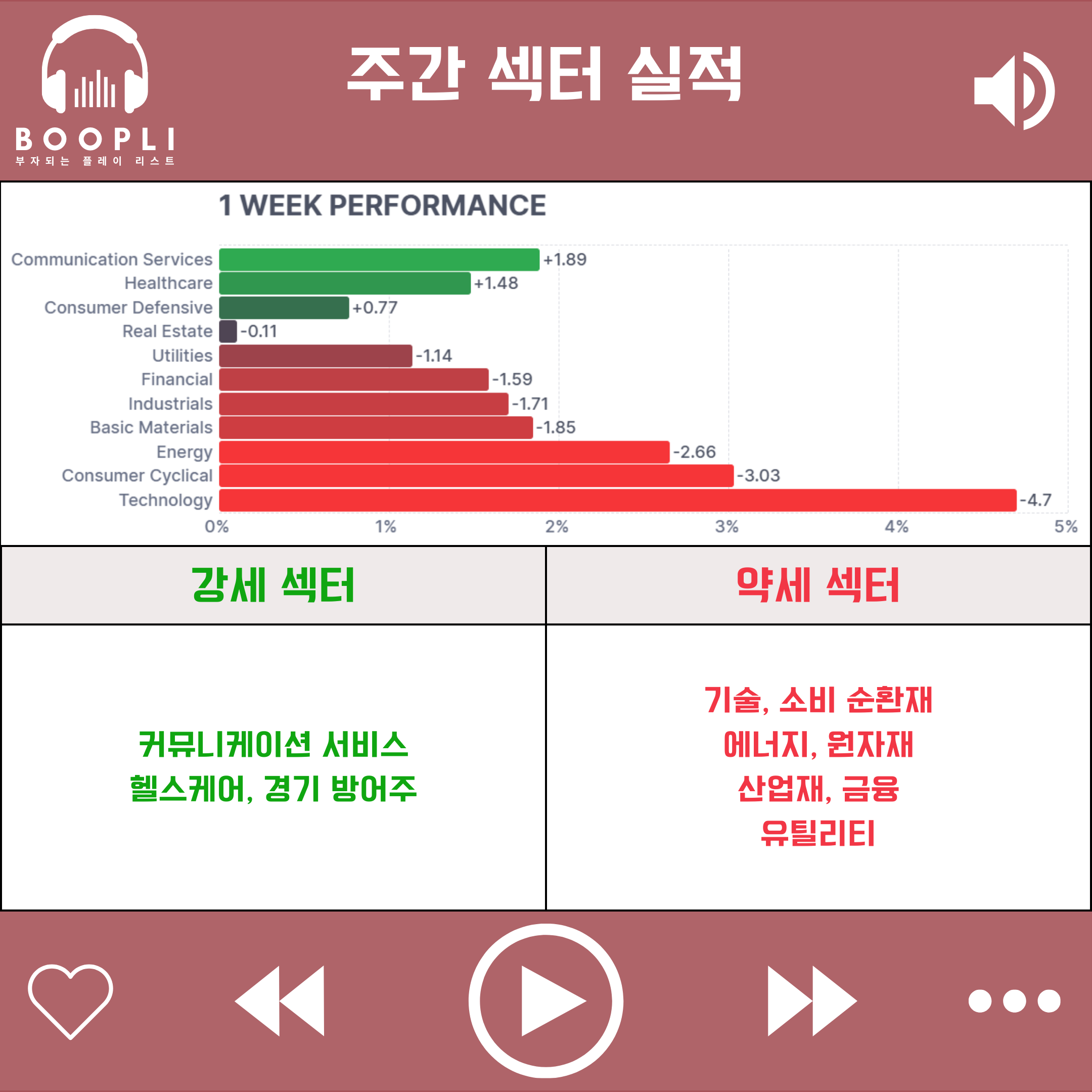 결과적으로 한 주간 미국 증시는 S&P500 -1.95%, 나스닥 -2.74%, 다우 존스 -1.91%로 하락 마감했다.