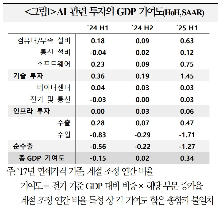 최근 AI 관련 투자 확대는 해외 수입 의존도가 높아 국내 부가가치 창출 효과가 제한적이고, 일부는 AI 인프라 구축 초기 단계에 나타나는 일시적 투자 급증이라는 점을 감안하면 직접적인 성장 기여도는 과대평가될 소지