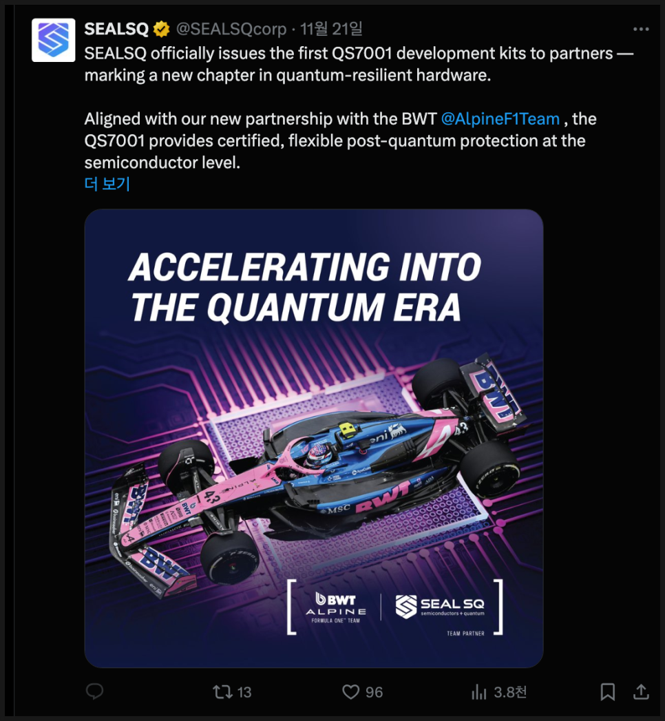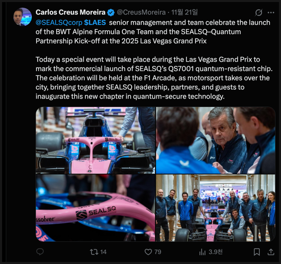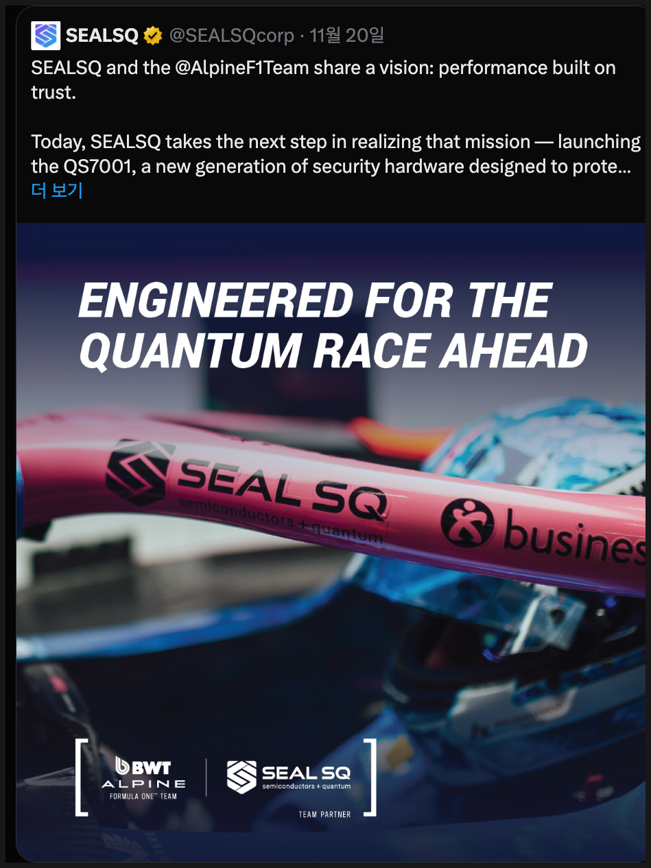 F1은 극도로 정밀하고 초고속의 데이터 흐름이 필요한 산업입니다. 차량 데이터, 전략 분석, 실시간 통신, 차량 상태 모니터링 등 모든 시스템이 보안과 연결되어 있습니다. 이러한 환경에서 보안 인증을 적용하면 SEALSQ의 기술이 얼마나 넓은 환경에 적용될 수 있는지를 보여주는 시범 사례가 될 수 있겠습니다.