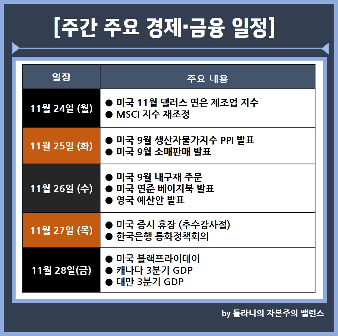 AI 버블론 및 관련 종목들들의 높은 밸류에이션으로 변동성을 보였던 미국 증시는 과연 이번주는 어떤 상황을 연출할지 지켜봐야 할 것 같습니다.