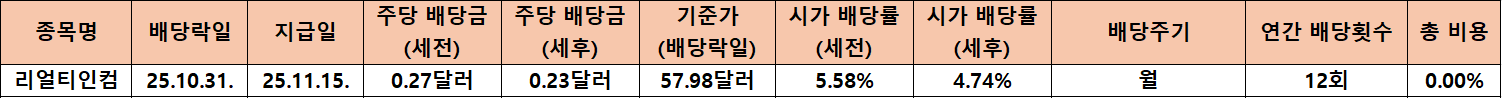 배당락일 기준 주가는 57.98달러로 지난해 같은 시점과 비교하면 0.09달러 상승한 것으로 나타났습니다. 변화 폭은 크지 않지만 소폭 상승을 기록하면서 안정적인 범위 내에서 움직였다는 점이 리츠 특성상 중요한 부분입니다. 리얼티 인컴은 고성장주처럼 큰 등락을 만들기보다 부동산 임대 기반 수익 모델에 맞춘 완만한 주가 움직임을 보이는 경우가 많기 때문입니다.