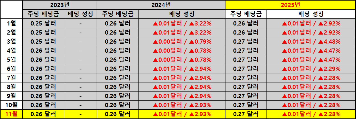 세후 기준 배당금은 0.23달러로 확인되며 실제 수령액을 고려할 때 세전 수치와 함께 살펴보는 것이 도움이 됩니다. 투자 입장에서는 배당이 매년 완만하게 증가하고 있다는 점만으로도 장기 현금흐름 기대감을 유지할 수 있는 부분이었습니다.