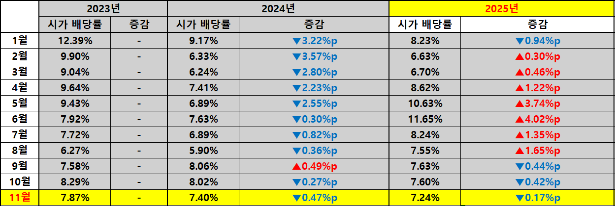 시가 배당률도 세전 기준 7.24%로 확인되었는데 지난해 같은 시점의 7.40% 대비 소폭 낮아졌습니다. 올해 월별 시가 배당률 추이를 보면 8%대 초반에서 중반까지 오르내리던 흐름이 최근 7%대 초반으로 내려오며 안정화되는 모습을 보였고 이는 배당금 감소와 기준가 변화가 함께 작용한 결과입니다. JEPI를 월배당으로 활용하는 투자자 입장에서 배당률이 높은 구간이 장점으로 평가되지만 그 수준이 일정하게 유지되기보다는 시장 환경에 따라 변화한다는 점을 다시 한번 확인하게 되는 데이터였습니다.