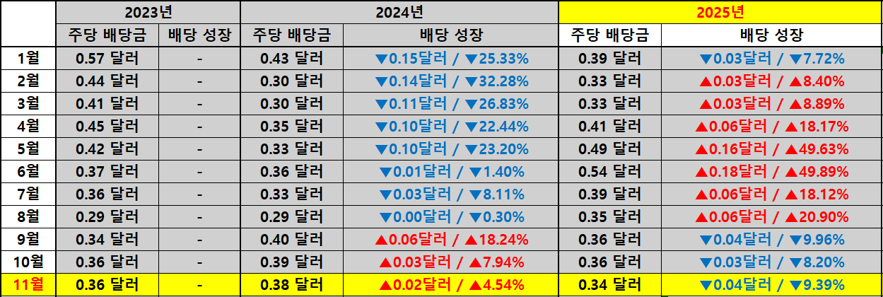 이번 11월 JEPI의 주당 배당금은 세전 기준 0.34달러로 집계되었으며 이는 지난해 같은 달의 0.38달러 대비 0.04달러 감소한 수치였습니다. 감소율은 약 9% 수준으로 단기적으로는 배당 흐름이 다소 약해진 모습을 보여준 셈입니다. 올해 전체 흐름으로 보더라도 월별 배당이 전년 대비 증가와 감소를 반복하며 일정하지 않은 패턴을 보이고 있어 배당 성장이 부드럽게 이어지는 ETF가 아니라는 점이 이번 데이터에서도 확인됩니다. 다만 JEPI의 배당 구조는 시장 변동성에 따라 옵션 프리미엄이 달라지는 특성이 있기 때문에 단기 변동만을 근거로 장기 매력을 평가하는 데는 무리가 있어 보입니다.