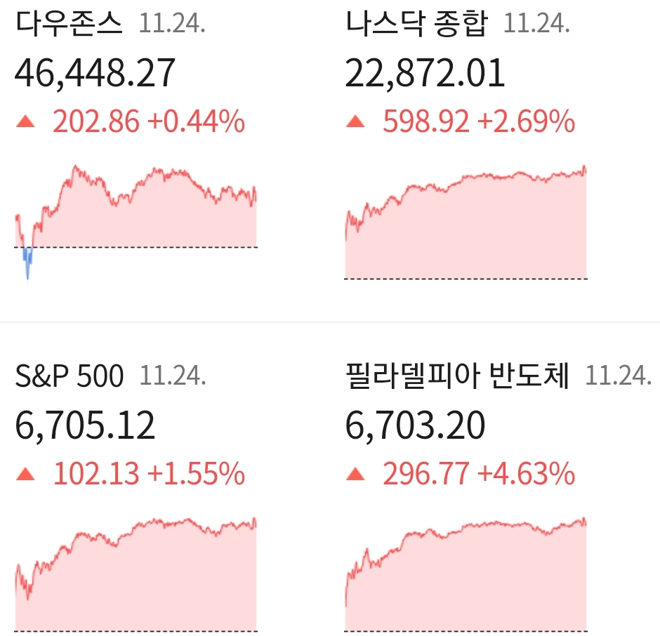 현지 시간 24일 미국 뉴욕 증시는 3대 지수 모두 큰 폭으로 상승하면서 장을 마감하였습니다. 연준의 12월 금리인하 기대감이 높아졌으며, 그 동안 하락세를 보이던 AI를 비롯한 기술주들이 큰 폭으로 반등하면서 미국 증시를 끌어 올렸습니다.