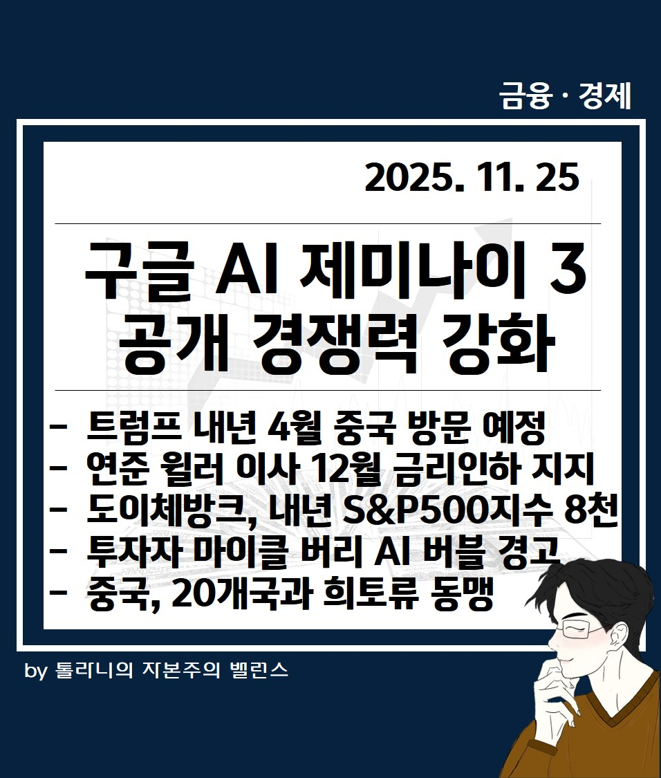 이에 '구글 알파벳 제미나이 3 공개 AI 경쟁력 강화 주가 급등, 트럼프 내년 4월 중국 방문 등 미국 증시 및 주요 국가 경제·금융 동향' 관련하여 언론 보도 및 국제금융센터 보고서를 통해 좀 더 자세히 알아보도록 하겠습니다.