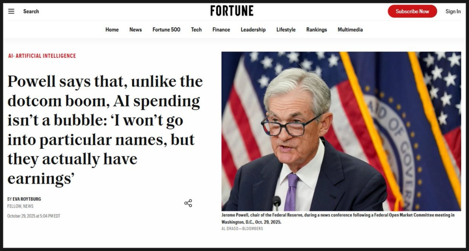최근 제롬 파월(Jerome Powell) 의장이 “AI 기업들은 실제로 수익을 내고 있으니 과거와 다르다”라고 말한 부분을 집어들며, 과거 그린스펀 발언과 닮은 점이 있다고 강조했습니다.