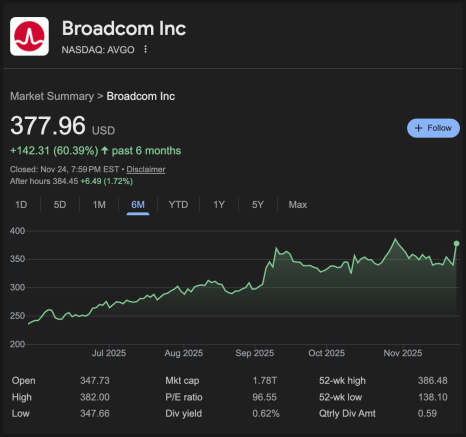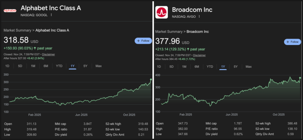 이렇게 구글이 기대감과 함께 압도적인 퍼포먼스를 보여주면서 GOOGL 주가도 많이 상승했는데요. 여기에 브로드컴 역시 동반 상승했습니다. 브로드컴은 구글의 AI 하드웨어 핵심인 TPU를 함께 설계하고 생산하는 역할을 맡고 있기 때문에, 구글이 AI에서 커질수록 브로드컴도 덩달아 커지는 구조입니다.