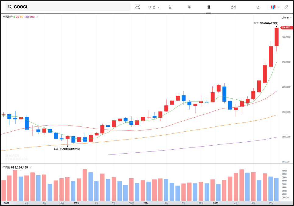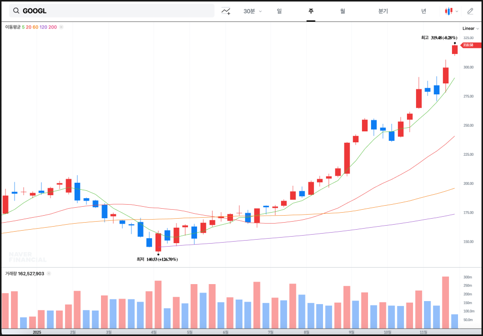가장 인상적인 부분은 월봉에서의 각 이동평균선이 모두 아래에서 완만하게 상승하며 지지를 제공하고 있다는 점입니다. 월봉 추세에서는 단순히 단기 뉴스가 아니라, 기업의 펀더멘털 변화나 시장 인식 전환이 반영됩니다. 현재의 주가 흐름은 구글의 AI 전략 강화, TPU 발표, 새로운 모델 공개 등이 시장에서 장기 성장 기대치로 연결되고 있다는 점을 보여줍니다.