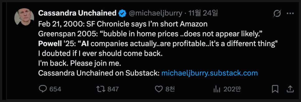 마이클 버리는 2008년 서브프라임 모기지 사태를 다룬 영화 “빅 쇼트(The Big Short)” 때문에 많은 분들께 익숙한데요. 마이클 버리가 이번에 공개한 새 뉴스레터는 “카산드라 언체인드(Cassandra Unchained)”라는 제목으로 연 379달러 구독료가 책정됐고, 그가 현재 시장을 바라보는 우려를 직접적으로 풀어내는 공간이라고 소개되었습니다. 버리는 지금의 AI 열풍이 과거 기술주 버블과 매우 비슷하다고 강조하면서, 이번에도 정책 결정자들이 위험 신호를 제대로 보지 못하고 있다고 주장합니다.