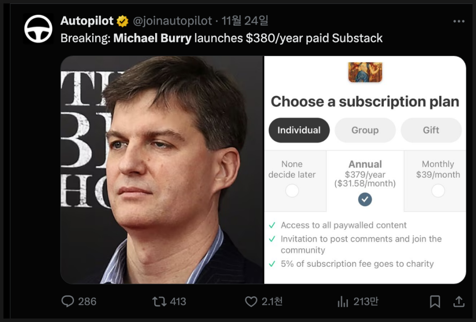 재밌는 건 AI 시장을 바라보는 또 다른 흥미로운 시각도 있다는 건데요. 최근 2008년 금융위기를 예견해 유명해진 투자자 마이클 버리( Michael Burry)가 헤지펀드를 등록 해지한 뒤, 자신의 AI 시장에 대한 비관적 견해를 정리한 뉴스레터를 새롭게 시작했다고 밝혔습니다.