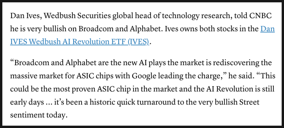 웨드부시(Wedbush)의 기술 리서치 총괄 댄 아이브스(Dan Ives)도 CNBC 인터뷰에서 브로드컴과 알파벳을 매우 강하게 긍정적으로 보고 있다고 밝혔습니다. 그는 “브로드컴과 알파벳은 시장이 다시 주목하고 있는 새로운 AI 플레이어들이며, 구글이 ASIC 분야를 실제 산업 중심으로 끌어오고 있다”고 말했습니다. 아이브스는 이들 칩이 현재 시장에서 가장 검증된 ASIC 가운데 하나이며, AI 혁명은 아직 초기 단계라고 평가했습니다.
