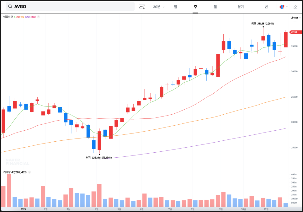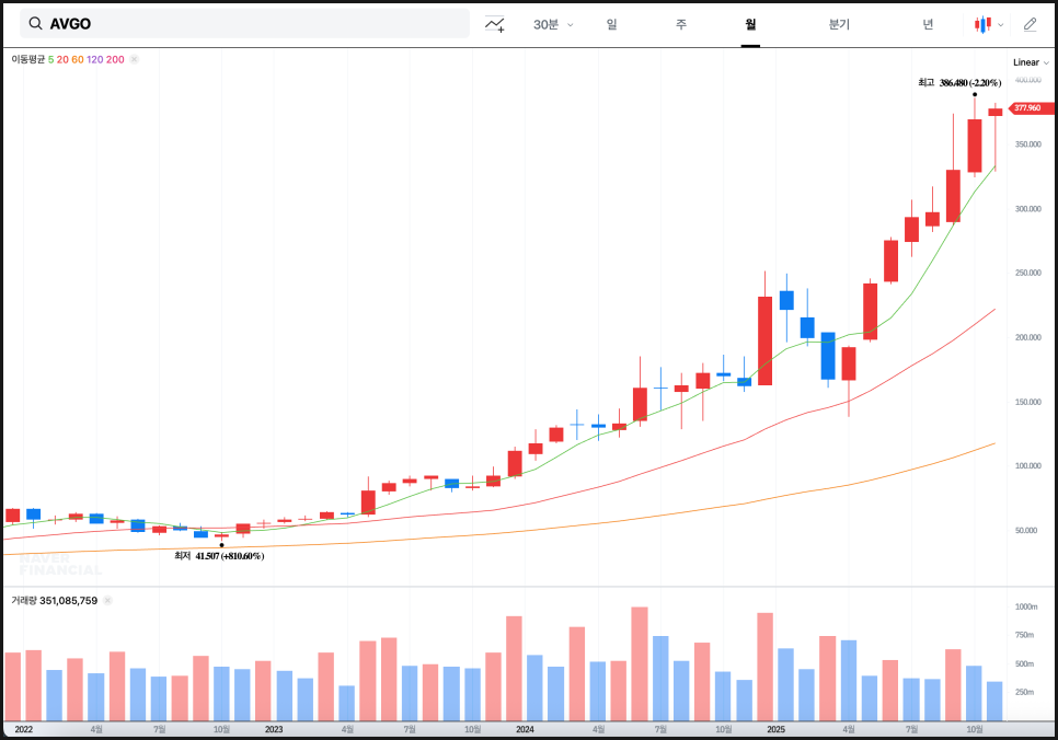거래량 역시 월봉 기준으로 봐도 뚜렷하게 유지되고 있어, 단발적인 수급이 아니라 구조적 관심이 브로드컴으로 흘러가고 있음을 확인할 수 있습니다. 최근 AI 칩 관련 모멘텀, 구글 TPU 프로젝트와의 장기 협업 기대가 이 장기 흐름과 정확히 맞아떨어지고 있는 상황입니다.