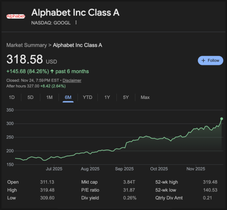 거래량은 9월 이후 명확하게 증가했고, 상승 캔들이 나올 때 거래량이 더 크게 붙는 패턴이 반복되고 있습니다. 시장이 알파벳을 향해 구조적으로 다시 자금이 몰리고 있다는 해석이 가능합니다.