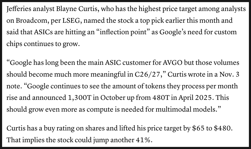 제프리스(Jefferies)의 블레인 커티스(Blayne Curtis) 역시 브로드컴을 톱픽으로 선정하며 비슷한 견해를 내놓았습니다. 그는 구글의 맞춤형 칩 수요가 C26~C27(2026~2027년) 시점에서 훨씬 큰 규모로 전환될 것이라고 예상했습니다. 특히 구글이 매달 처리하는 토큰 수가 2025년 4월 480조 개에서 같은 해 10월에는 1,300조 개로 늘어났다는 점을 강조하며, 멀티모달 모델 확산에 따라 이 수요가 더욱 증가할 것이라고 분석했습니다. 그 역시 목표주가를 480달러로 상향하며 브로드컴 주가가 추가로 40퍼센트 이상 상승할 여지가 있다고 평가했습니다.