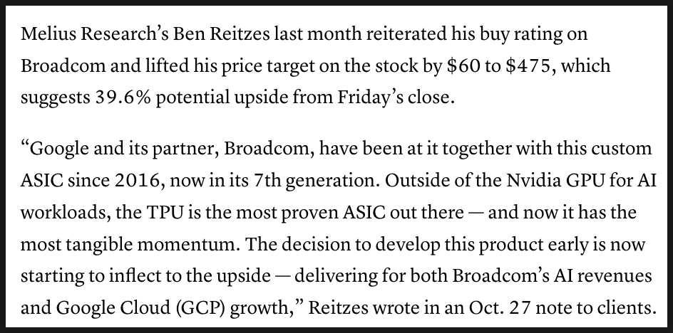 시장에서는 이 협력 관계의 가치가 시간이 갈수록 커지고 있다며 전망을 한층 높이고 있습니다. 멜리우스 리서치(Melius Research)의 벤 라이트지스(Ben Reitzes) 애널리스트는 브로드컴 목표주가를 475달러로 올리며, TPU가 이미 7세대에 이르고 있고 엔비디아 GPU를 제외하면 가장 검증된 AI ASIC이라는 점을 강조했습니다. 그는 “구글과 브로드컴이 이 칩을 2016년부터 함께 개발해왔고, 이제 그 조기 투자 결정이 본격적인 수익으로 돌아오고 있다”고 평가하면서, 향후 브로드컴이 알파벳뿐 아니라 다른 기업들에게서도 큰 수혜를 볼 수 있다고 전망했습니다.
