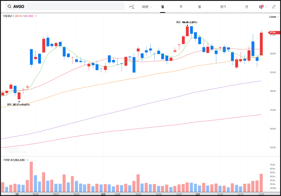 이제 브로드컴(AVGO) 주가 차트를 보죠. 일봉을 보면 최근 며칠 사이에 변동성이 눈에 띄게 커졌습니다. 단기 이동평균선 근처에서 등락을 반복하던 흐름에서 벗어나, 강한 양봉을 만들며 위로 치고 올라간 뒤 바로 되돌림이 나오면서 시장의 매수·매도세가 단기적으로 충돌하고 있는 모습입니다. 단기 상승을 시도한 후 조정이 들어왔지만, 캔들의 하단이 이평선 위에서 지지를 받는 형태라서 추세 자체가 돌아섰다고 보기는 어렵습니다. 거래량도 단기 상승 구간에서 늘어난 상태라, 시장 참여자들이 여전히 관심을 유지하고 있다는 점이 확인됩니다.