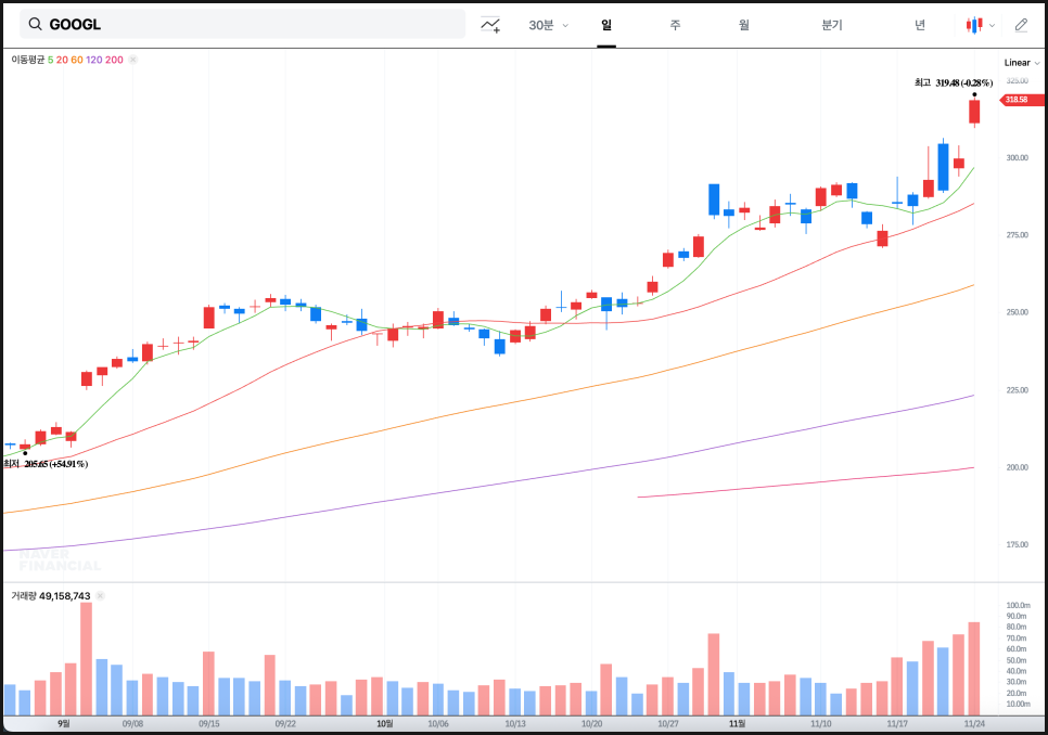 먼저 구글 주가 일봉을 보면 최근 한 달 동안 주가가 매우 가파르게 상승한 흐름이 눈에 띄는데요. 단기 이동평균선 위에서 안정적으로 움직이면서 조정이 들어올 때마다 매수세가 빠르게 받쳐주는 모습입니다. 5일선과 20일선 모두 뚜렷한 상승 기울기를 유지하고 있고, 거래량도 이전보다 꾸준히 늘어난 상태라서 단기 수급이 확실히 강하게 붙어 있다는 걸 보여줍니다.