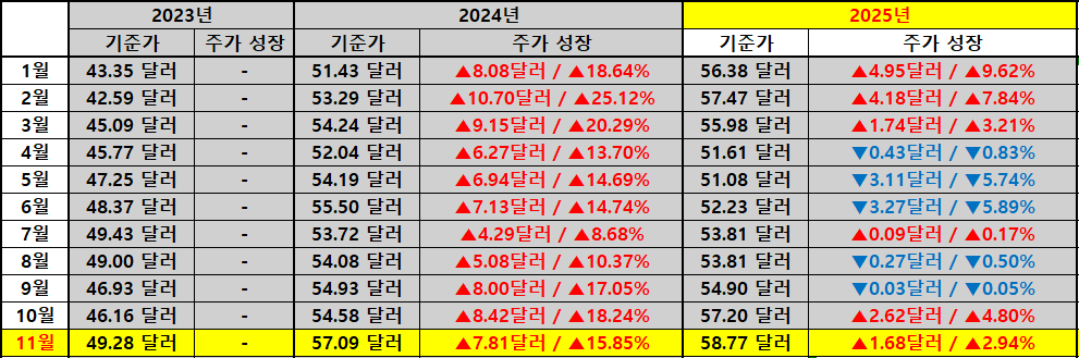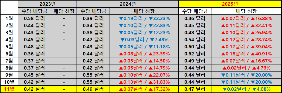 배당 수준 변화 먼저 살펴보겠습니다. 11월 기준 주당 배당금을 보면 2023년에는 0.42달러였고 2024년에는 0.49달러로 늘었습니다. 금액 기준으로 0.07달러 증가했고 성장률로는 약 17.32%가 기록되었습니다. 1년 사이에 두 자릿수 성장률을 보여 주면서 배당 인컴 측면에서는 상당히 공격적인 상승 흐름을 경험한 셈입니다.