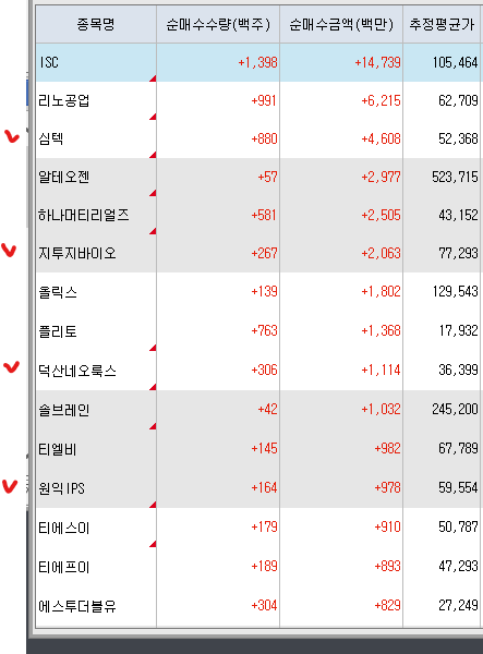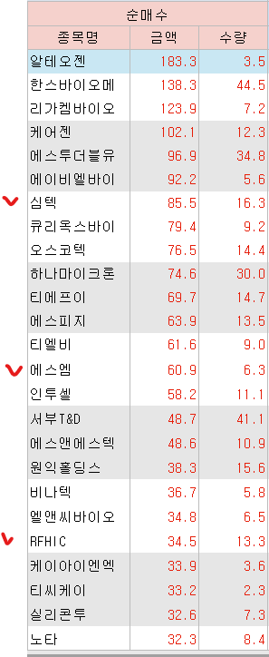 매도 : HLB 좋은 사람 리노공업 한국첨단소재 하나마이크론 제주반도체 ISC(+55.48%) 스맥(+30.35%) 심텍 SK스퀘어 나우로보틱스