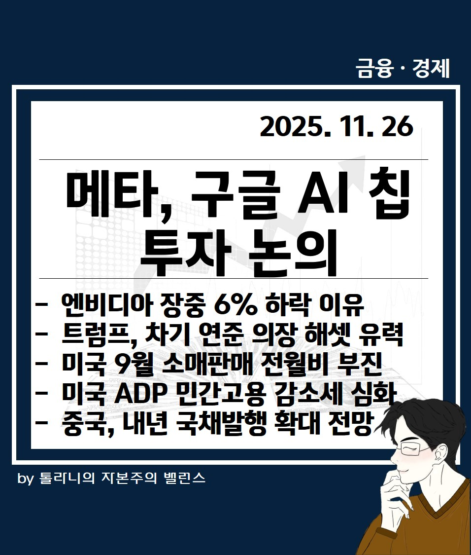 ● 반면 엔비디아는 관련 소식 이후 장중 6% 이상 빠지다 2.6% 하락으로 장을 마쳤다. 시장은 엔비디아가 지배해온 AI 칩 분야에 경쟁사들의 압력이 커질 수 있다는 신호로 받아들이는 분위기다.