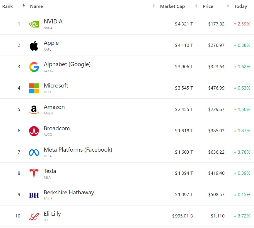 엔비디아는 구글 AI 제미나이 3.0 발표로 장중 한때 6% 이상 하락하였지만 낙폭을 줄이면서 -2.59% 하락 하면서 거래를 마쳤습니다. 반면 구글의 모회사 알파벳 +1.53%, 애플 +0.38%, 마이크로소프트 +0.63%, 아마존 +1.50%, 테슬라 +0.99%, 메타 +2.78% 상승하면서 가래를 마쳤습니다.
