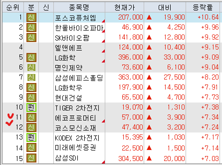 리튬가격 반등에 따른 2차전지 업황 회복 기대감에 2차전지주 강세(엔켐 +11.47%, 에코프로 +11.04%, 포스코퓨처엠 +10.64%, 에코프로비엠 +9.46%, 엘앤에프 +9.15%, LG화학 +9.09%, 코스모신소재 +7.24%, 삼성SDI +7.03%)