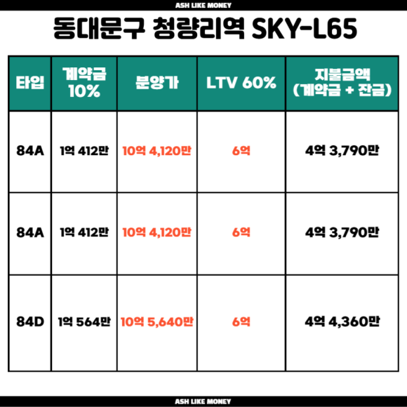그런 청량리역 SKY-L65에서 불법행위로 인한 재공급이 나왔다. 현재 시세는 20억이 넘는데, 분양가는 10억 중반이라 10억을 벌 수 있는 로또청약이다. 청약자격도 서울특별시 거주하는 무주택세대 구성원, 청약통장 무관, 전매제한 없음, 실거주 의무도 없다. 다만, 재당첨제한 10년이란 규제가 붙는다. 84A타입 2가구, 84D타입 1가구의 총 3가구가 분양신청가능하다. 발코니 확장/옵션은 기존 계약승계만 가능하고 변경은 불가능하다.