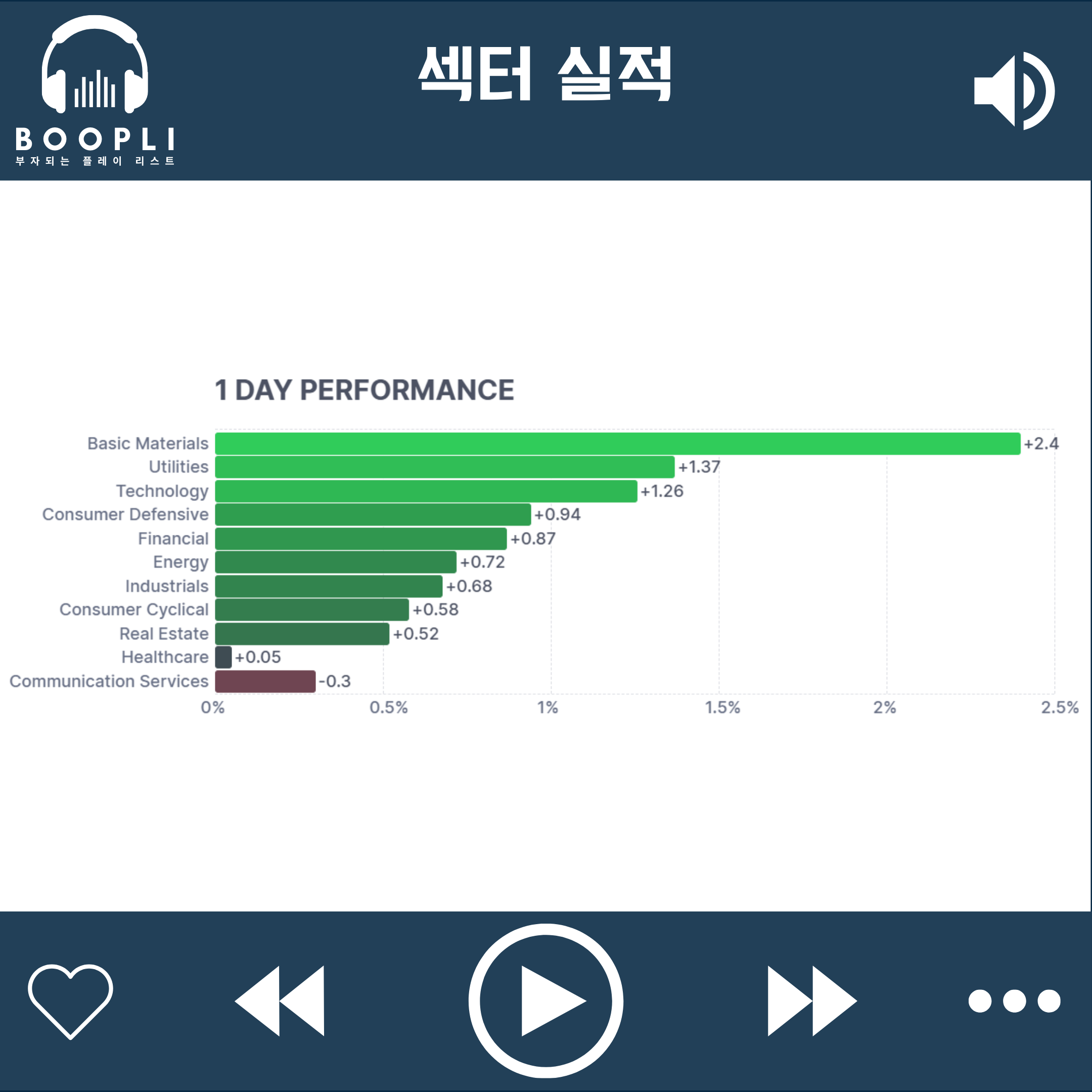 원자재 섹터가 상승을 주도했고, 이어서 유틸리티, 기술, 경기 방어주, 금융, 에너지, 산업재, 소비 순환재, 부동산 순으로 강세