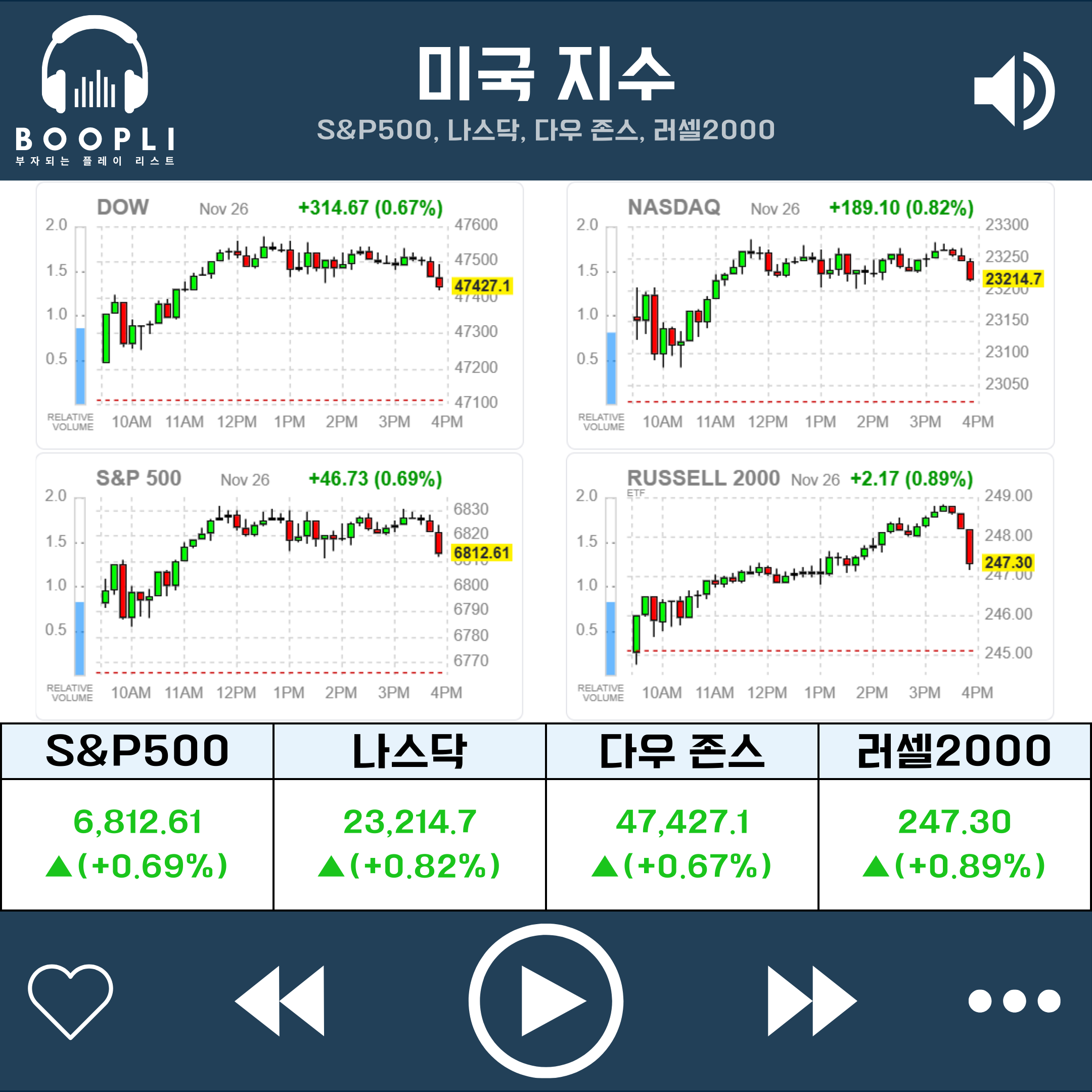 전일 미국 증시는 추수감사절 휴장을 앞두고 거래량이 감소한 가운데, 12월 금리 인하 기대가 유지되고 AI 및 비트코인 등 위험자산 선호 심리(Risk-On)가 강화되며 다우존스(+0.67%), S&P500(+0.69%), 나스닥(+0.82%), 러셀2000(+0.89%) 등 주요 지수 모두 상승 마감했다.