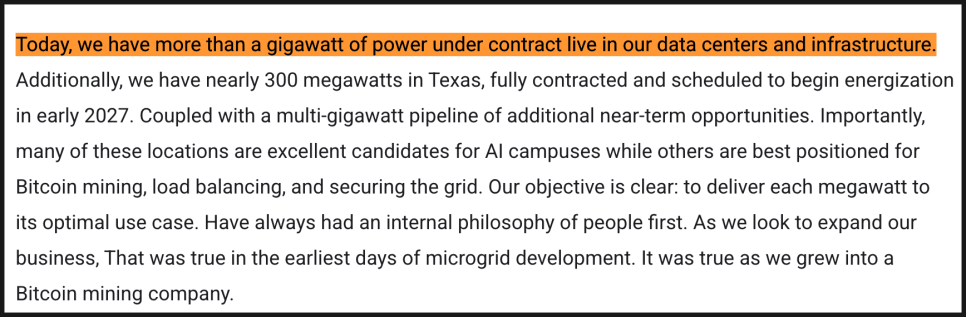 실제로 경영진은 컨퍼런스콜에서 회사의 체질 자체가 달라지고 있다는 점을 아주 강하게 강조했습니다. 기본적인 비트코인 채굴 사업은 여전히 굳건하게 유지하면서, 동시에 미국 전역에서 확보한 전력과 토지 기반을 활용해 AI 데이터센터 기업로 도약하겠다는 전략을 본격적으로 공표한 것이죠.