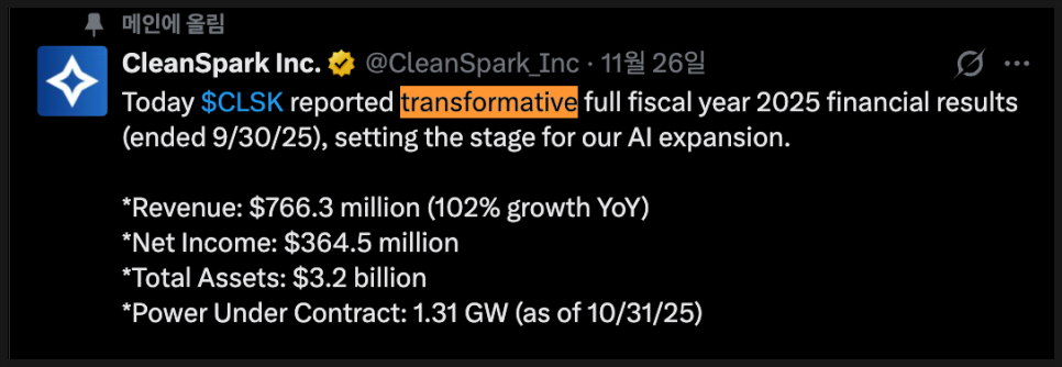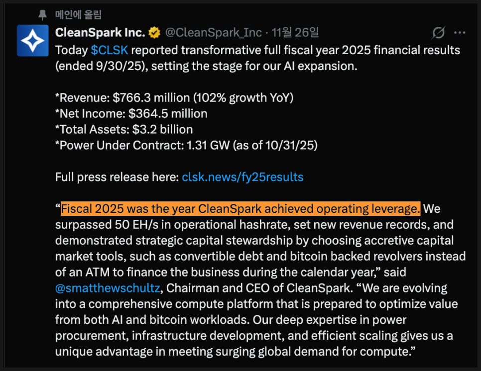 재무 측면에서도 흥미로운 부분이 있었는데요. CFO 게리 베키아렐리(Vecchiarelli)는 비트코인 가격 상승 덕분에 생긴 평가이익을 제외하고도, 올해 조정 EBITDA(핵심 영업이익 지표)가 약 3억 500만 달러에 달한다고 밝혔습니다. 비트코인 가격에 휘둘리지 않는 지속 가능한 영업 이익 구조를 만들었다는 점을 강조한 것이죠. 클린스파크가 채굴 효율을 극단적으로 끌어올리고, 전력 단가를 낮추고, 채굴 장비를 최적화하는 방식으로 안정적인 채굴 수익성을 확보했기 때문입니다.