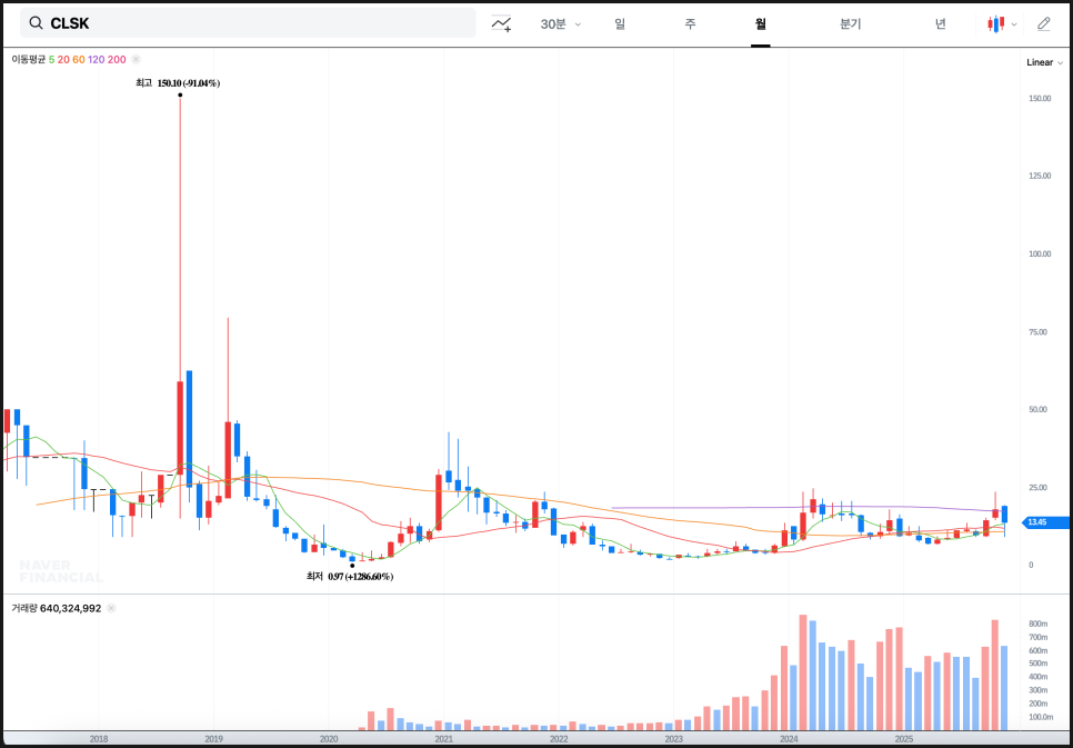 짧게 요약하자면 클린스파크의 월봉은 긴 조정이 끝나가고, 거래량이 살아나며, 장기 추세 전환의 문 앞에 서 있는 형태인데요.