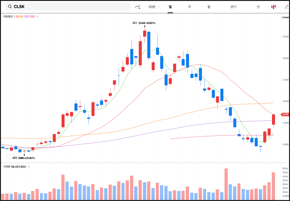 긍정적인 부분은 올해 후반 들어 거래량이 다시 살아났다는 점과 저점이 조금씩 높아지고 있다는 점입니다. 전체적으로 보면 CLSK는 하락장에서 벗어나 추세 전환을 시도하는 초기 단계에 있습니다.