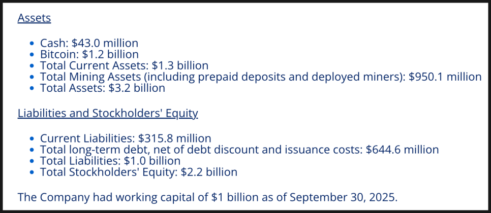 현금은 4,300만 달러, 채굴 장비 가치는 9억 5,010만 달러, 전체 자산은 32억 달러였습니다. 자본총계는 22억 달러로 건전하며, 유동자산이 10억 달러에 달해 공격적 확장에도 재무 체력이 탄탄한 편입니다. 장기 부채는 6억 4,460만 달러로 확장 중인 기업 규모 대비 무리 없는 수준이며, 전환사채의 대부분은 낮은 비용의 자본 조달로 분류됩니다.